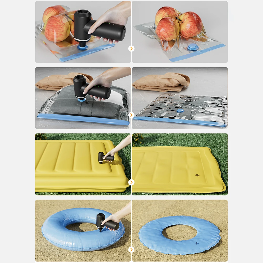 2. Versatile Nozzle Options: The compression blower comes with 4 different nozzles, making it suitable for handling various inflatable products such as air mattresses, air beds, inflatable cushions, inflatable toys, swimming rings, pool floats, inflatable sofas, pool rafts, vacuum storage bags, and more. It meets your inflation or suction needs both indoors and outdoors.